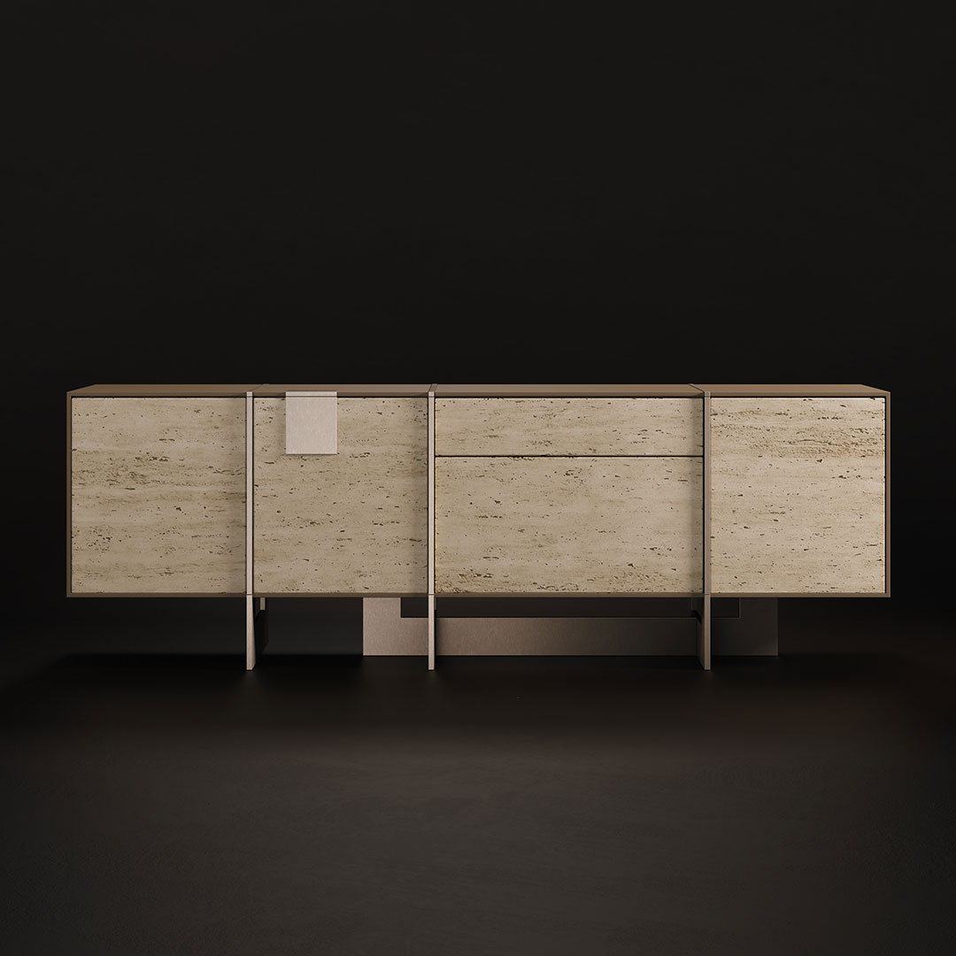 Structure: Leather-Covered Black Stained Ashwood and Grey Kendzo Marble Doors; Legs: Brushed Gun Metal; Details: Grey Kendzo Marble, Brushed Gun Metal and Leather