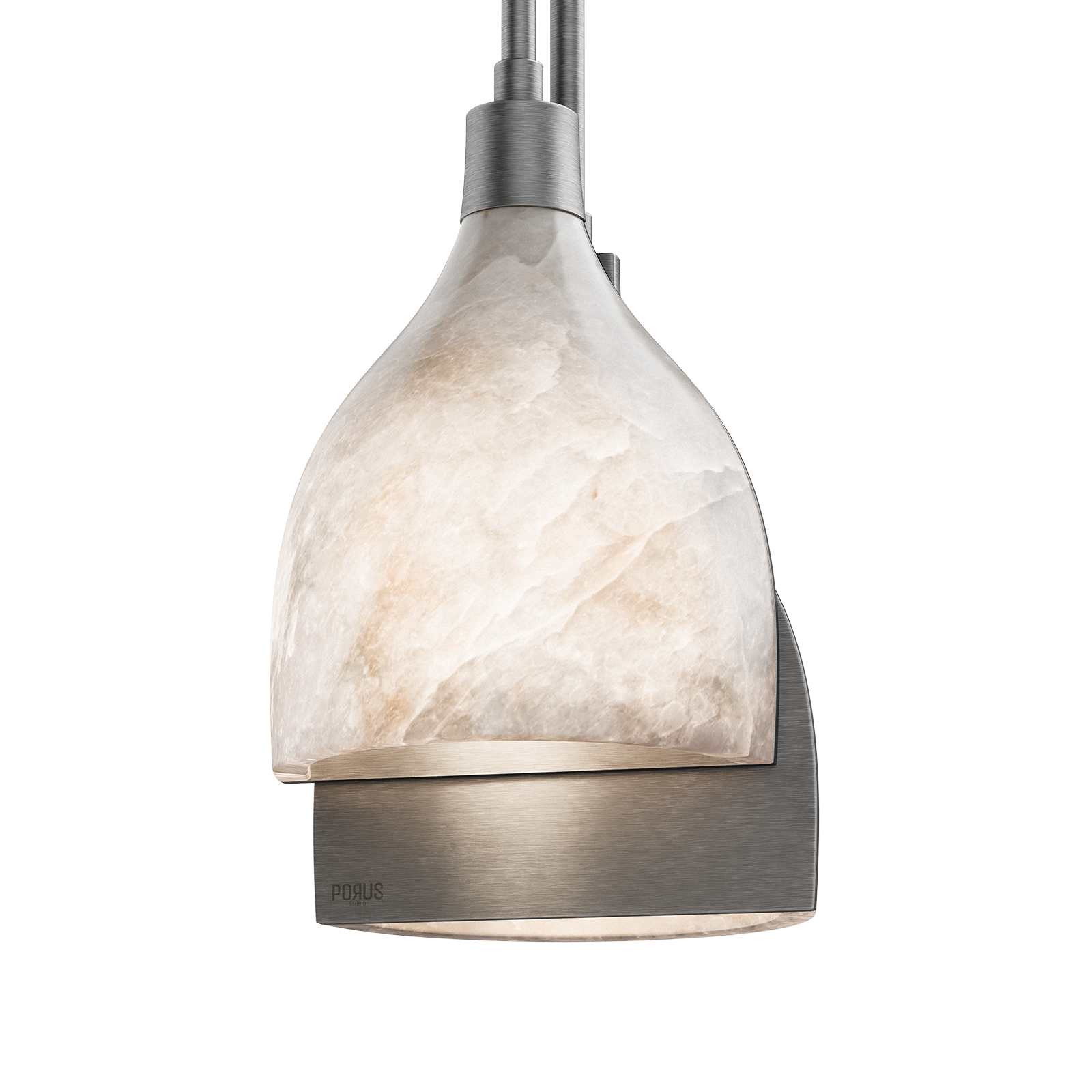 A profile view of the Foundry pendant lamp on a white background, highlighting the staggered heights of the two stainless steel rods and the elegant curve of the alabaster details.