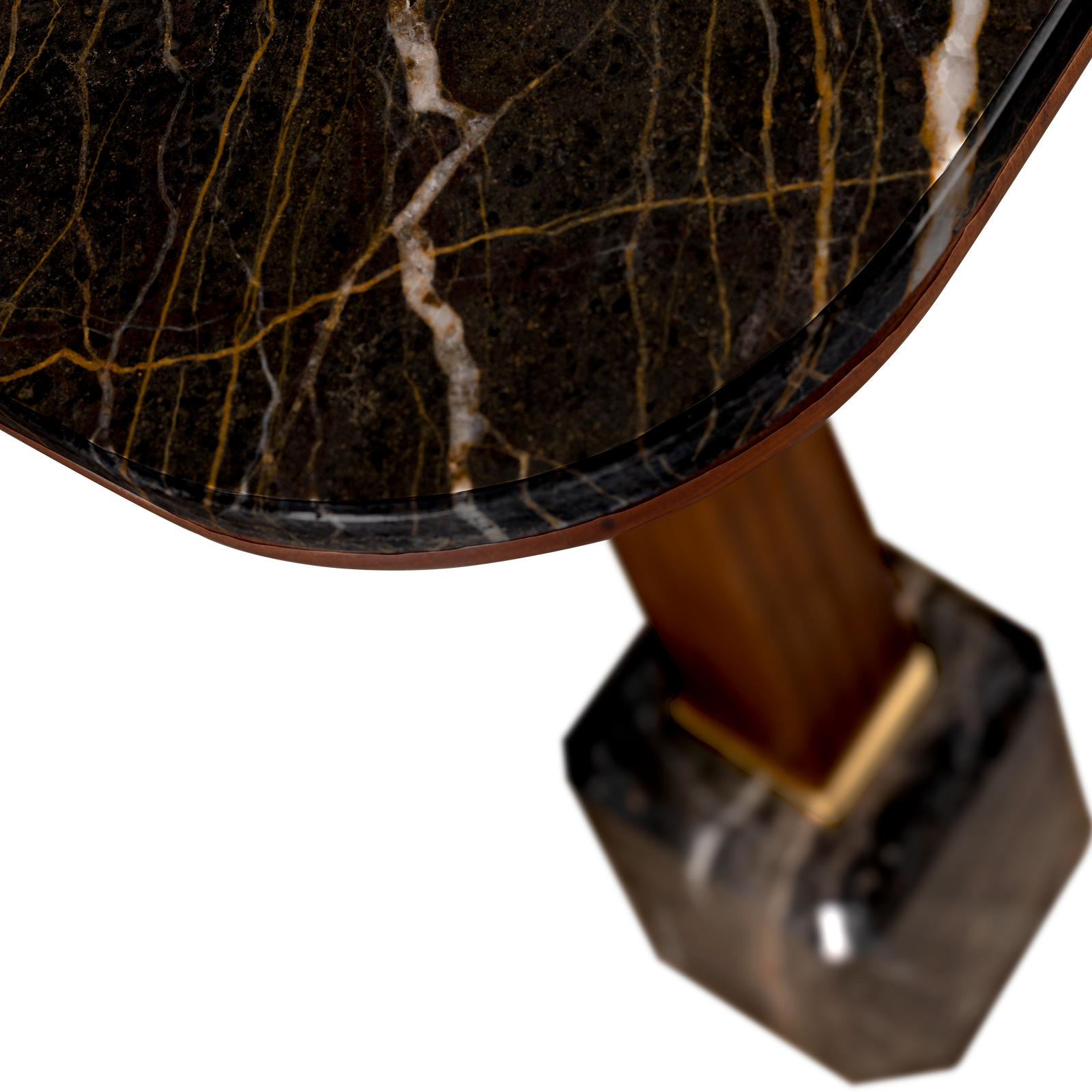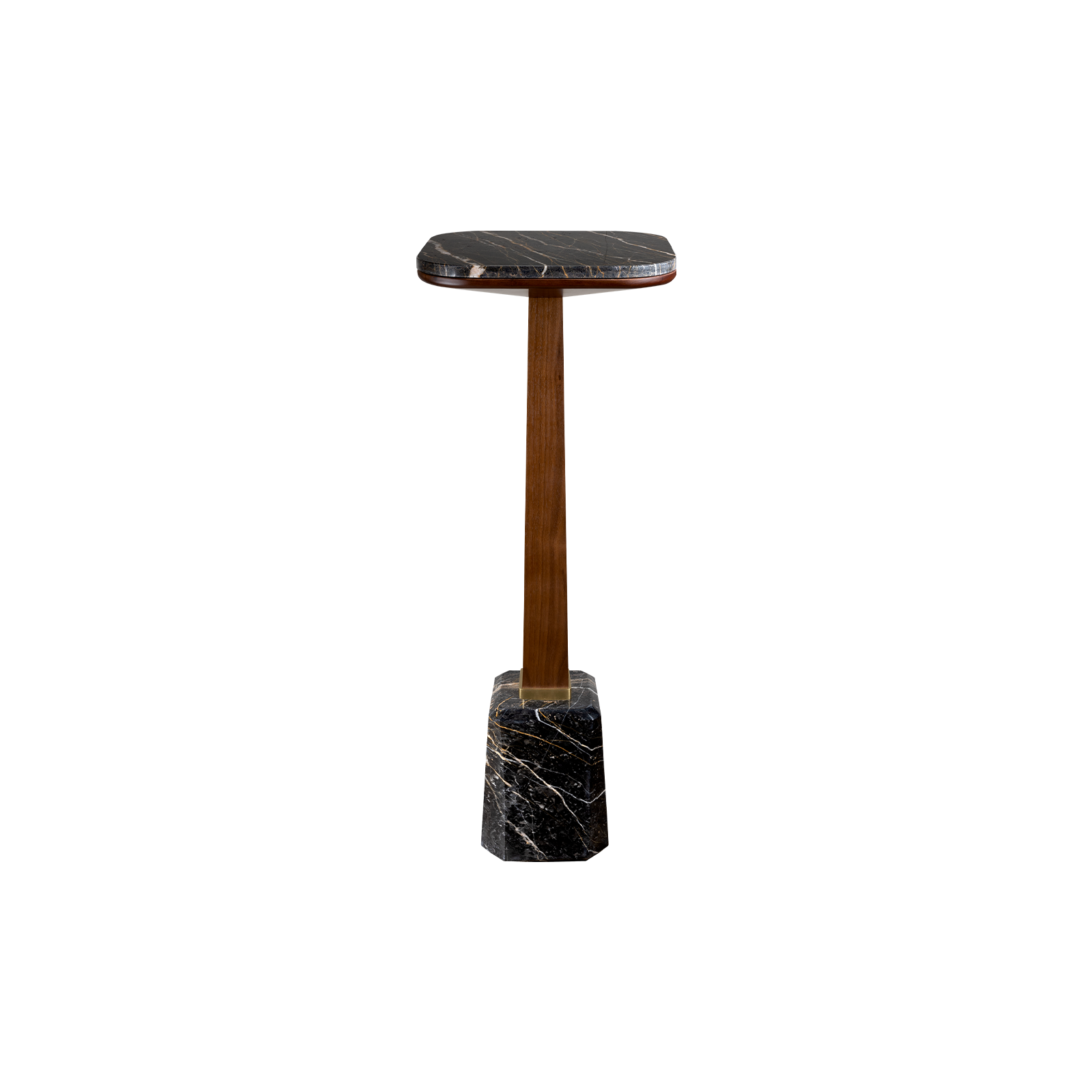 At the heart of this exquisite creation lies a luxurious Black and Gold Marble table top and base. A second top and body in natural walnut wood, with a velvety matte varnish, add a warm and inviting touch to the modern Oakland Bar Table.