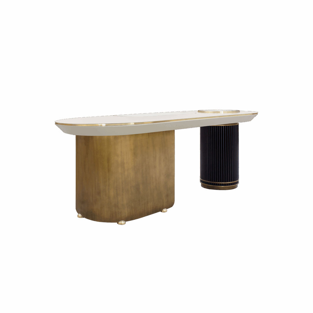 The Arizona office desk features details in marble, brass, and leather. This asymmetrical desk design keeps your interior space on trend.