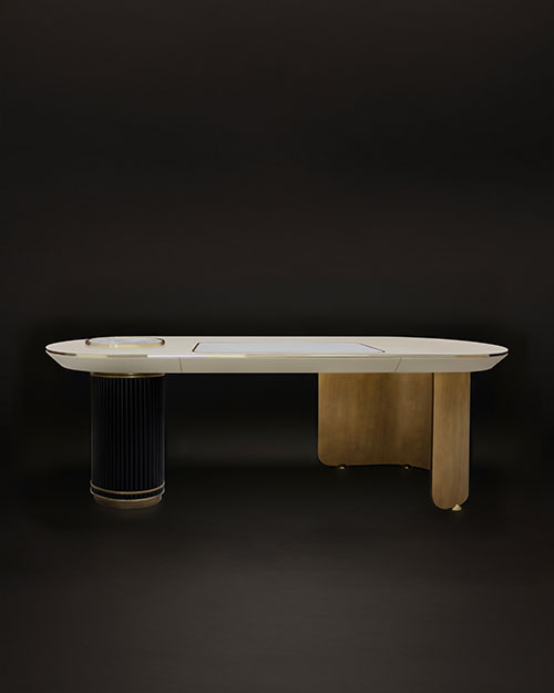 Transforming sights into deluxe living protagonists, Porus Studio designers conceived the Arizona desk. Featuring an informal balance, the lacquered wood top is supported by two asymmetric feet, one made of brass and the other in lacquered wood.