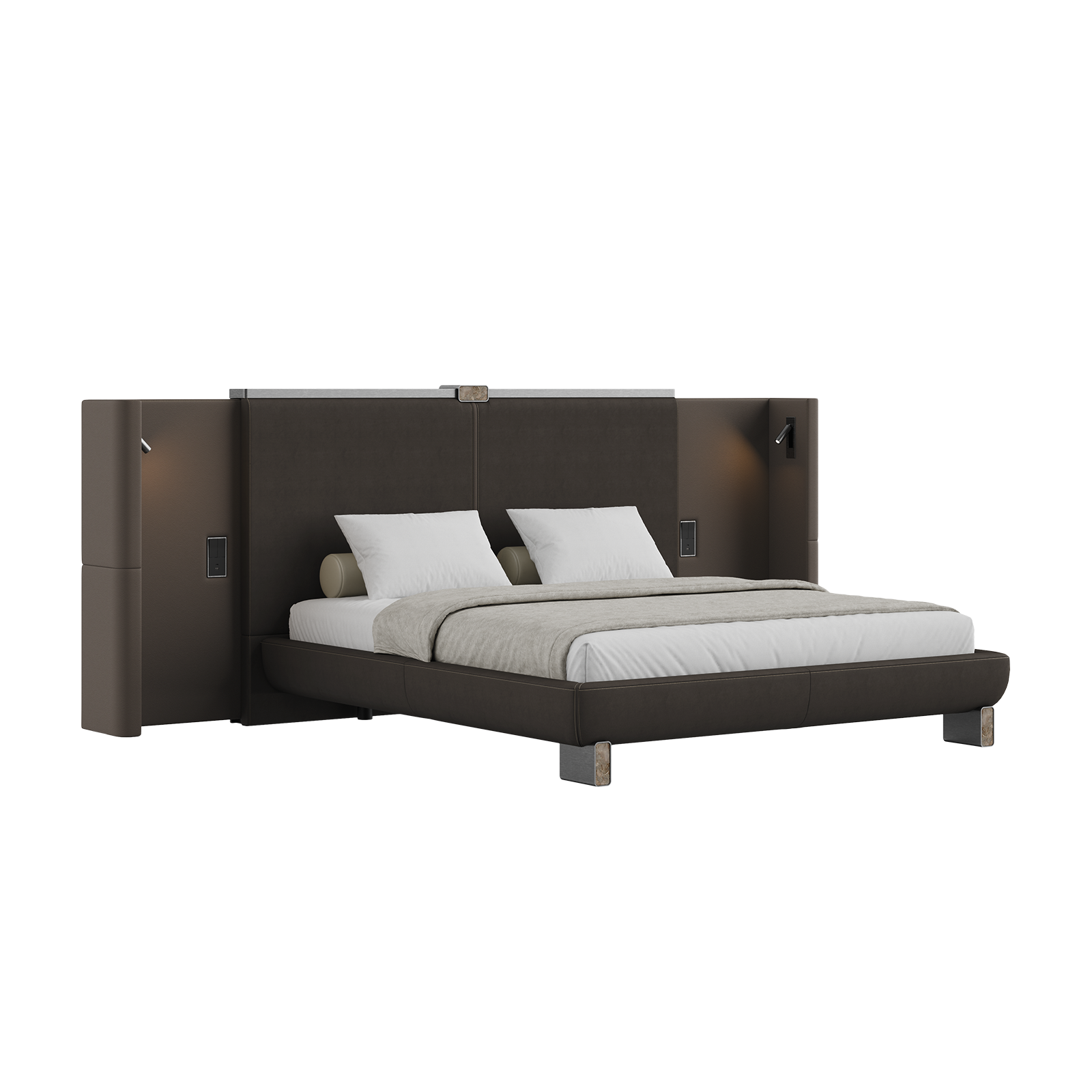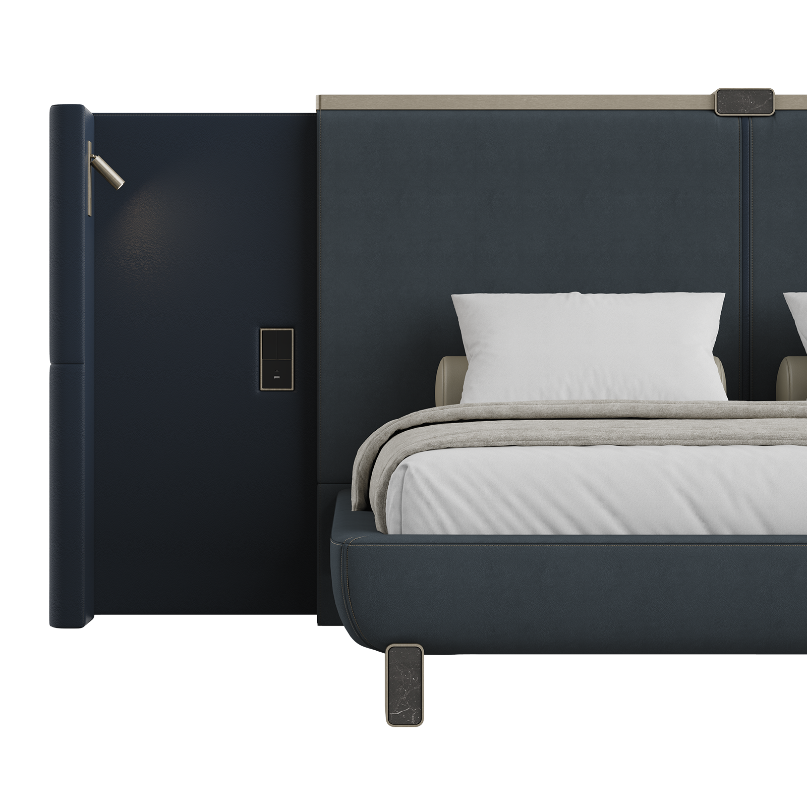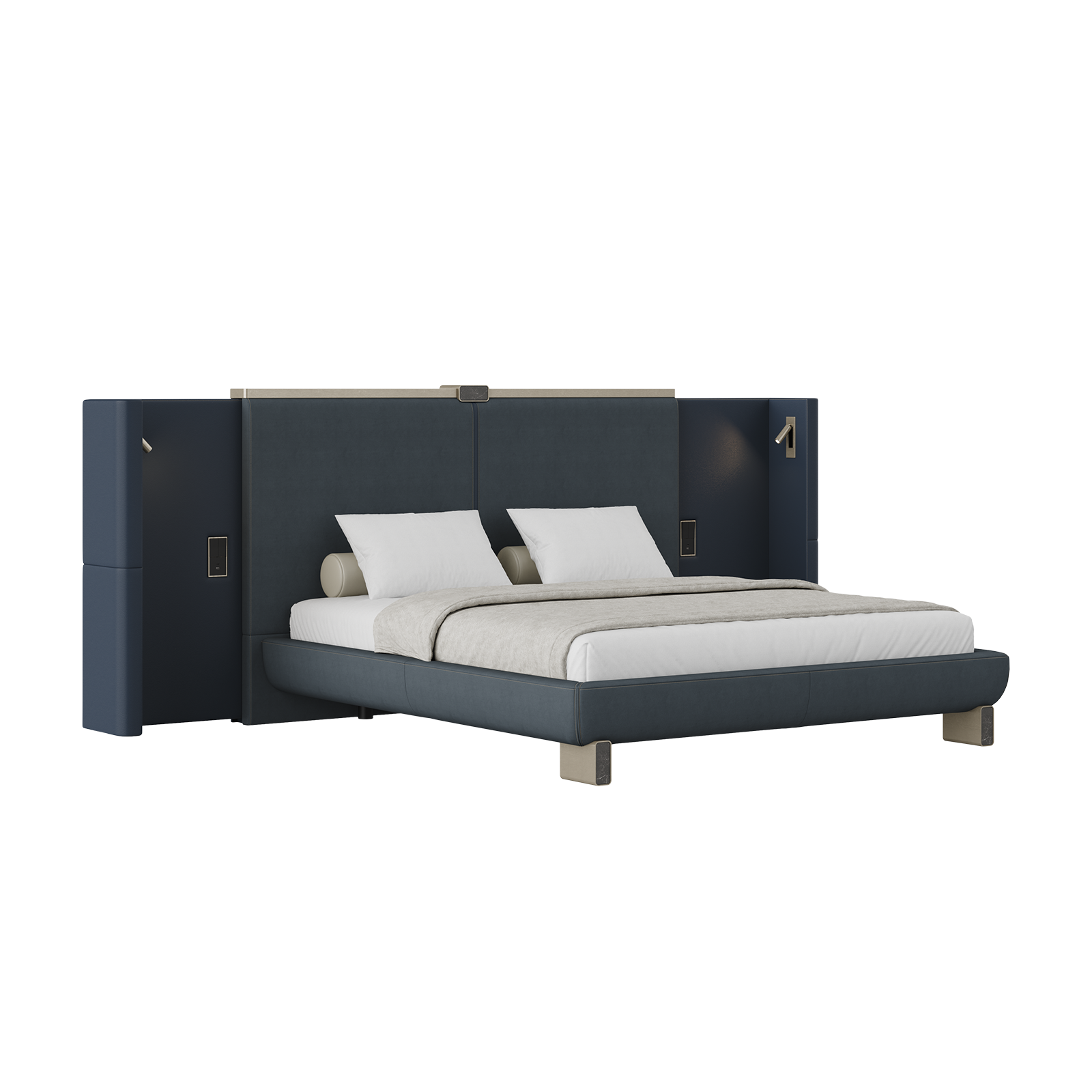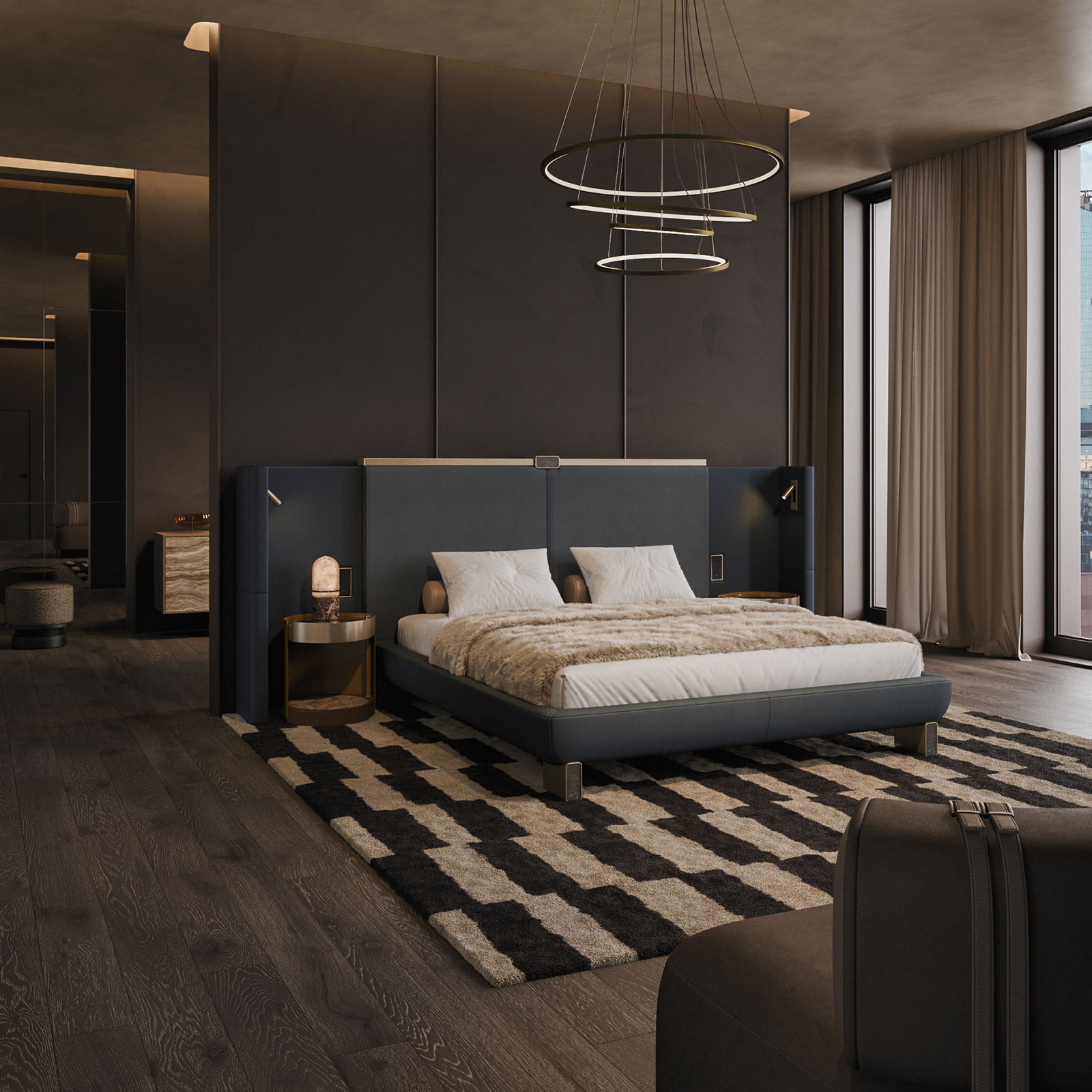 The Broadway Bed adaptable headboard expands gracefully, widening its silhouette and revealing two embedded lamps that cast a warm, architectural light across the sleeping area.