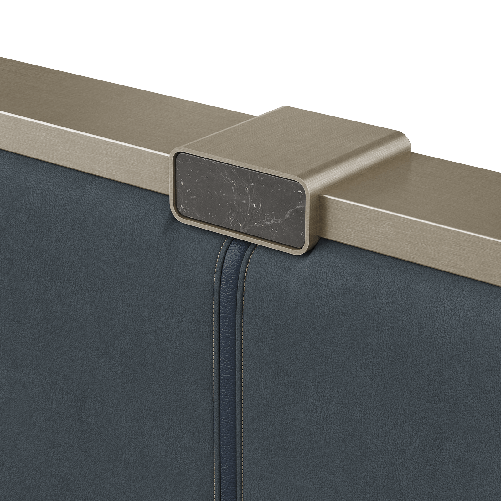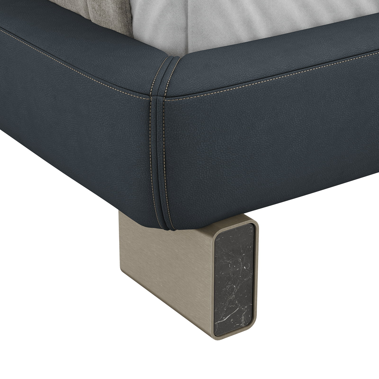 Upholstered in nubuck and leather, and complemented by stainless steel and marble feet, the Broadway bed balances tactile richness with structural clarity.